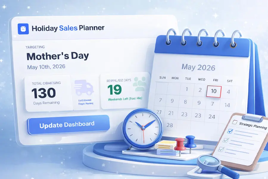 Track how many days remain before key holidays and events. Perfect for planning promotions and creating urgency at the right time.