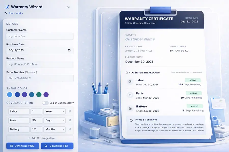 Calculate warranty start and end dates accurately based on job or purchase dates. Avoid confusion and give customers clear, professional warranty timelines.