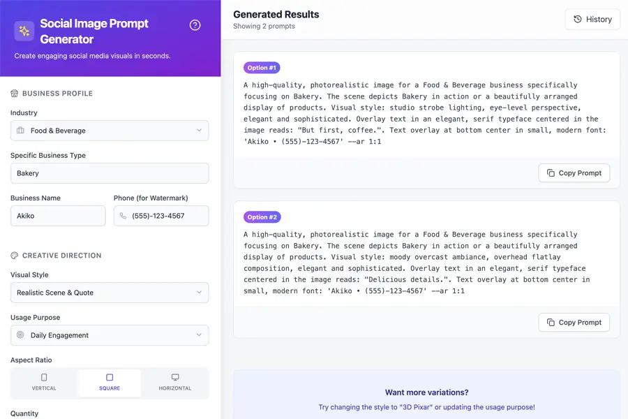 Create ready-to-use image prompts designed specifically for local promotions, offers, and announcements. Perfect for generating eye-catching visuals in any AI image tool without guesswork.